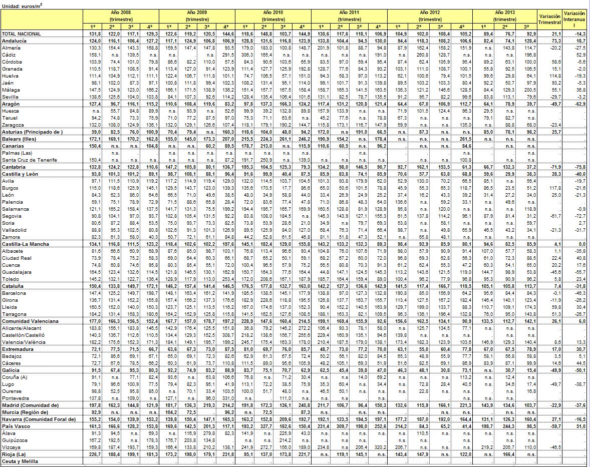 El precio del suelo en nuestro país se desplomó a lo largo de 2013. Los datos que podemos manejar de la evolución del precio del suelo durante 2013 indican una caída constante, que se escenificaba claramente en el tercer trimestre cuando el metro cuadrado urbano se situaba en los 147,5 € presentando una caída interanual del 12,4%.
