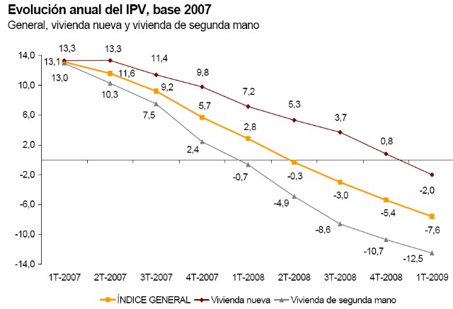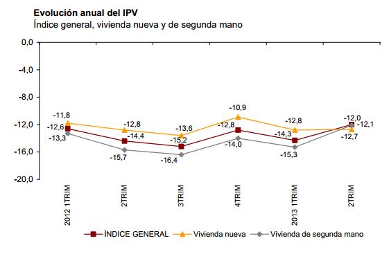 - 2012 En este año se producen las tasas más bajas desde 2007.Por tipo de vivienda, los precios de la vivienda nueva disminuyen un 2,9% entre el segundo y el tercer trimestre del año. Los de la vivienda de segunda mano bajan un 4,4%. La tasa de variación anual se sitúa en -15% .