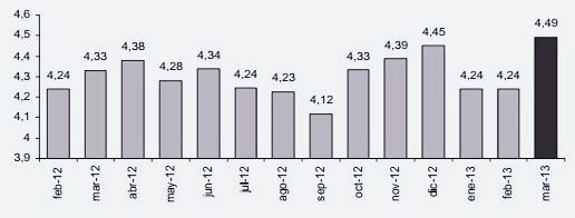 - Hipotecas constituidas sobre fincas urbanas: valor de 2.866 millones de euros, un 34,2% menos que en marzo de 2012.